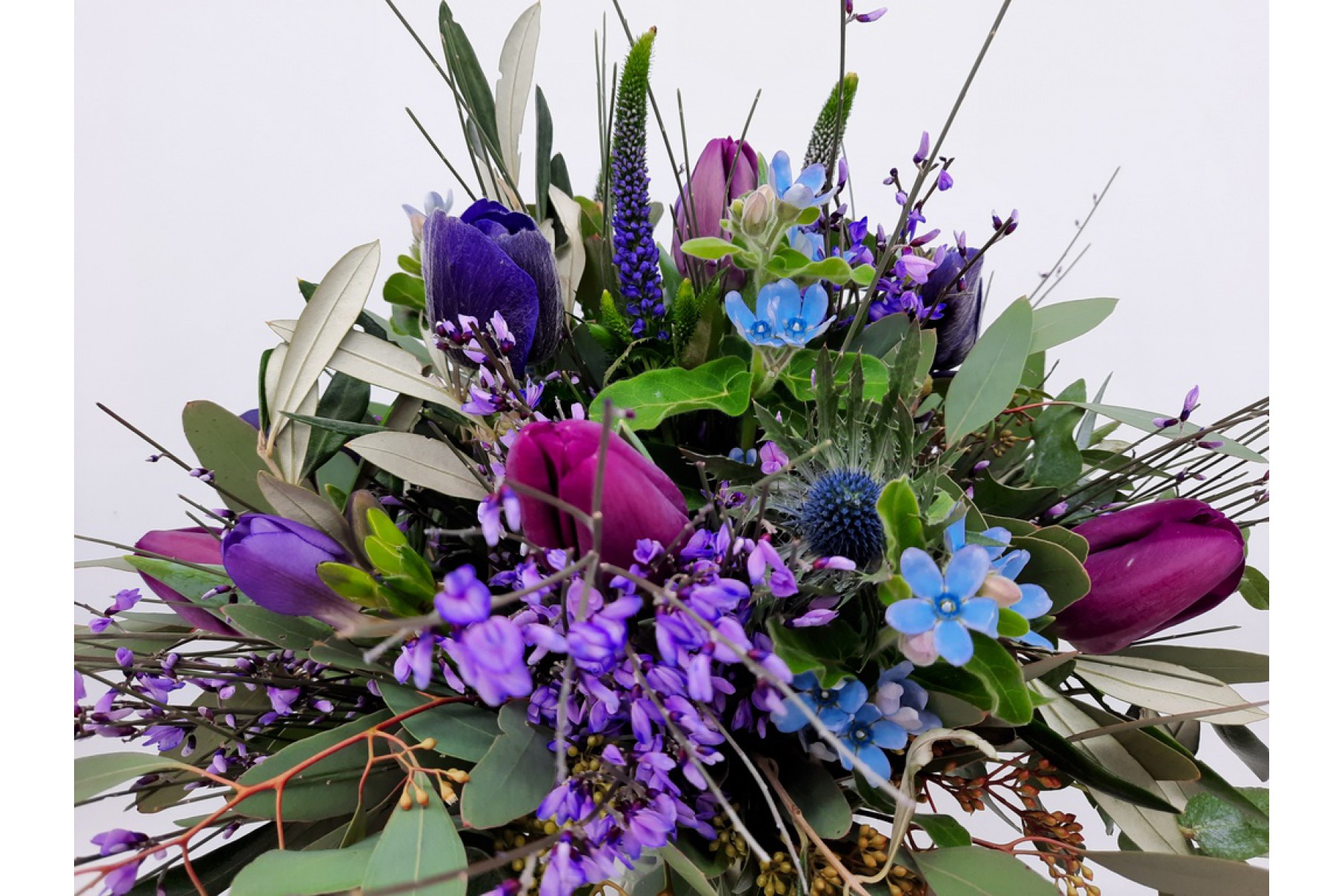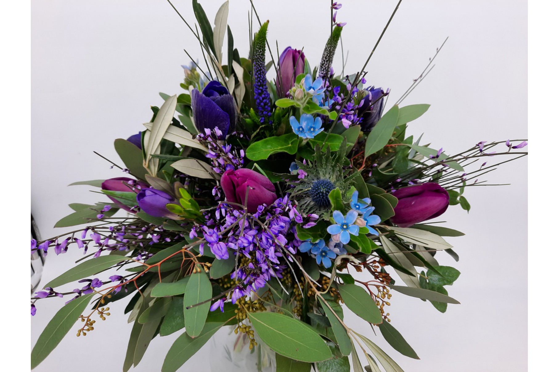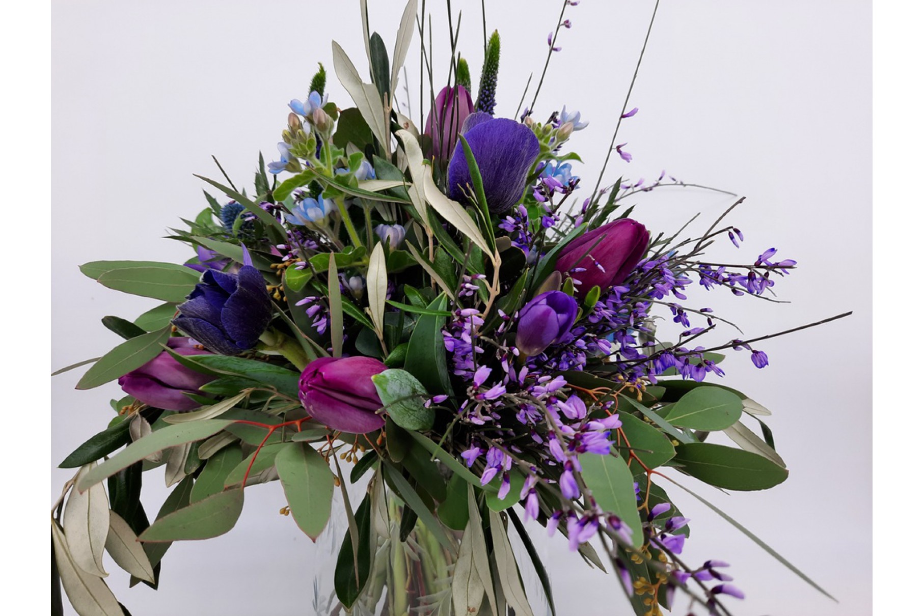 Duftig gebundener Blumenstrauß in lila Tönen mit verschiedenen Frühlingsblumen und Schnittgrün.